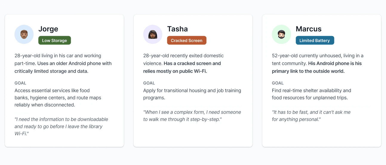 Takeaway: Key info like shelter availability and eligibility is often unclear. Safe Haven should be a reliable, easy-to-use hub that supports users of all digital skill levels.