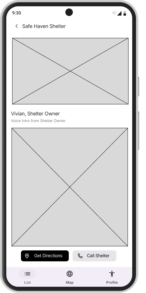 Tapping a shelter brings users to a page where they can hear a short voice snippet with key information. The simple layout keeps the focus on essential details, making it easy to understand quickly.