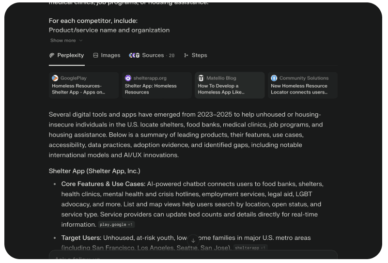 We used Perplexity for market research to analyze competitors, user feedback, and academic studies to guide our design decisions.